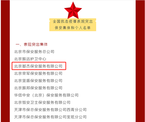 2020年12月,公安部對全國抗擊疫情表現(xiàn)突出保安集體和個(gè)人通報(bào)表揚(yáng)。北京都杰安防科技有限公司河北分公司,榮獲“表現(xiàn)突出集體”稱號。