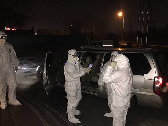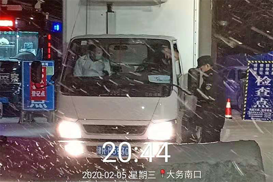 接送兩名去武漢送物資的貨車司機(jī)前往隔離點(diǎn)進(jìn)行交接隔離